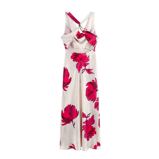 Florales Neckholder-Kleid in Schwarz mit roten Blüten